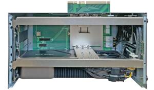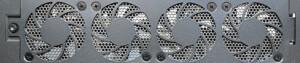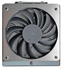 Esto se debe a que tanto los grandes de 8 centímetros (que se muestran a la derecha) como los pequeños de 4 centímetros se pueden reemplazar en segundos desde el exterior. Simplemente abra uno o dos tornillos, levante el ventilador (o el conjunto del ventilador; el ventilador de 4 cm viene en una tira de cuatro) y reemplácelo. No se necesitan cables. Un toque atento y muy apreciado si falla uno de los fanáticos. Mirando la superficie de la placa de expansión, observe las dos ranuras PCIe adicionales, una para un módulo x1 y la otra para uno x4.