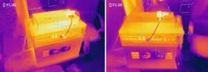 Las imágenes térmicas a continuación se tomaron con la cámara FLIR One Pro. Muestra el GP-3000 en medio de la ejecución de uno de los muchos puntos de referencia a los que lo sometimos. Incluso con la gran tarjeta Nvidia RTX 3090 en su carcasa de expansión, las temperaturas de escape y de la superficie apenas superaron los 80 ° F. La única excepción en las imágenes térmicas es la fuente de alimentación externa del sistema que colocamos en la parte superior de la computadora.