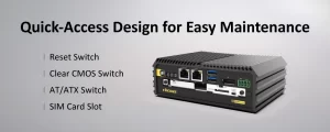 Para facilitar la configuración y los ajustes, el DA-1200 agrupa controles clave —como el botón de reinicio, el interruptor de modo AT/ATX y la ranura para tarjeta SIM— en el área frontal de mantenimiento. Este diseño intuitivo permite realizar la configuración o instalación sin abrir el chasis, reduciendo eficazmente el tiempo de inactividad y minimizando los costos de mantenimiento.