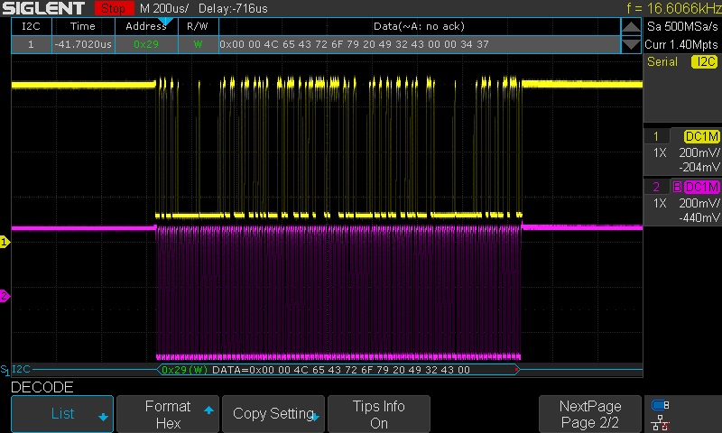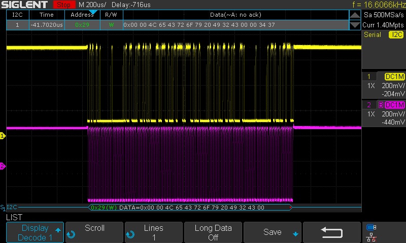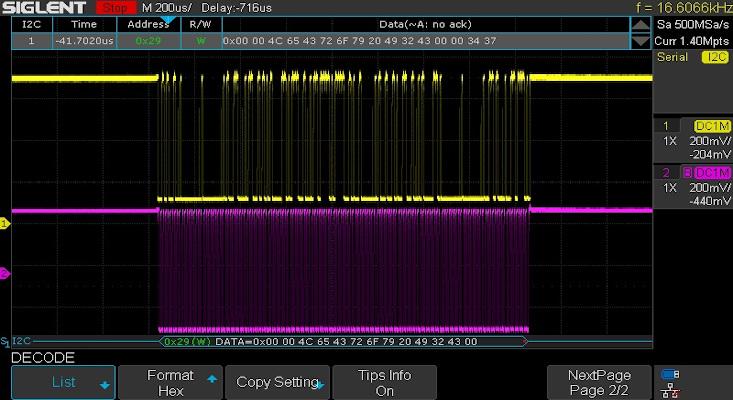 1. Configure SDS1X-E to deliver stable serial decoding on the signal of interest. In this example, we are looking at an I2C signal.