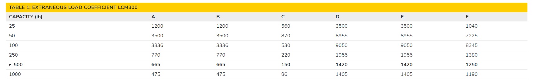 - Seleccione los coeficientes de carga extraña proporcionados por la tabla para la capacidad del sensor.