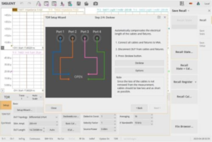 Con un VNA de 4 puertos, son posibles mediciones diferenciales completas. Esto es importante para señales y sistemas de alto rendimiento que utilizan rutinariamente señalización diferencial para comunicaciones de alta velocidad. Aquí usaremos una topología diferencial de 2 puertos para probar nuestros cables USB. Tenemos dos conectores diferenciales SMA a USB-A que conectamos al VNA usando cables y adaptadores N a SMA. Los siguientes pasos en el Asistente de Configuración ayudan con la calibración y el ajuste de estos cables y conexiones para nuestra topología seleccionada. La figura 2 muestra la primera ventana del asistente de calibración de apertura. Esto es seguido por algunas conexiones a través y conexiones de carga opcionales para calibrar la configuración para su dispositivo. La calibración mecánica adicional o Ecal también se puede realizar desde la interfaz de Configuración de TRD.