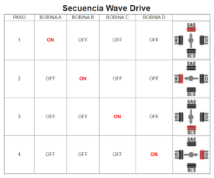 Secuencia Wave Drive: En esta secuencia se activa solo una bobina a la vez. En algunos motores esto brinda un funcionamiento más suave. La desventaja es que al estar solo una bobina activada, el torque de paso y retención es menor.