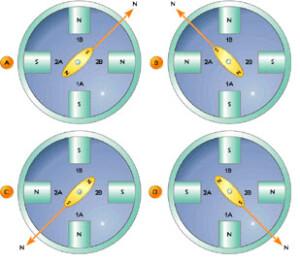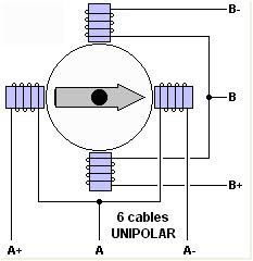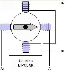 Su funcionamiento es similar a los motores eléctricos comunes, que sólo giran cuando se aplica el voltaje, pero a diferencia de estos cuentan con más de 2 estatores lo que divide una rotación completa (360°) en un gran número de pasos rotacionales. En el siguiente ejemplo tenemos 4 estatores a los que su polaridad varía en secuencia, obteniendo 4 pasos: