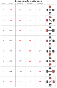 Secuencia de medio paso. Es esta secuencia se activa las bobinas de tal forma que se puede brindar un movimiento igual a la mitad del paso real. Para ello se activan primero 2 bobinas y luego solo una y así sucesivamente. Como vemos en la siguiente imagen a secuencia completa consta de 8 movimientos en lugar de 4.
