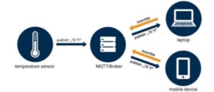 MQTT usa una topología de tipo PUSH/SUBSCRIBE para ejecutarse sobre TCP/IP. Dentro de la arquitectura del MQTT existen dos tipos de sistemas: Clientes y Brókeres. Un Broker es el servidor con el que se comunican los clientes y que cuentan con su dirección IP pública, en donde los mismo reciben comunicaciones a la vez que las mandan entre ellos. Los Clientes no se comunican directamente entre sí, sino que lo hacen al conectarse al Broker. Cada cliente puede tener la función de editor, subscriptor o ambos. En la imagen de abajo se explica la función del sensor para ‘publicar’ la información de su lectura al Broker usando el MQTT; y los clientes suscritos al Broker pueden ver la publicación (solicitar la información guardada en el bróker).