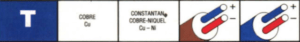 El Termopar tipo T tiene un rango de temperatura de -200 a 400 °C (-320 a 750°F), se recomienda utilizar en un rango entre -185 a 298 °C (-300 °F a 600 °F) y con una sensbilidad entre 43 a 49 µV/°C aproximadamente y una precisión de ±0.5 °C. Código de color: Azul