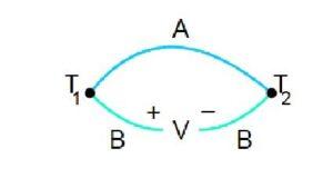 De igual manera se puede ilustrar como un circuito termoeléctrico que contenga dos uniones correspondientes a los metales distintos de unión, que para este ejemple serán Metal A y Metal B. Los alambres de los Metales Ay B forman uniones a diferentes temperaturas T1 yT2, lo que resulta en un potencial V (fem) que es posible medir.
