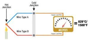 Teniendo en cuenta lo que hace un Termopar, y su funcionamiento básico, vamos a ver un poco más a fondo cómo trabaja. Cuando tenemos un calentamiento en la junta de medición, esto provoca una tensión eléctrica, la cual, es aproximadamente proporcional a la temperatura. Esto es debido a dos factores: